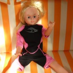 Farbe Neopren royalblau mit Schriftzug und Figur, Farbe Lycra gelb,