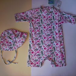 Einteiler mit UV-Schutzfaktor 50, Material 57 % Polyester, 31 % Baumwolle, 12 % Elastan, Abblockung von mehr als 97,5 % der schädlichen UVA und UVB-Strahlen, mit passendem breitkrempeligen Hut, Druckknopfleiste für das bequeme Anziehen,