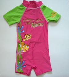 Badeanzug mit integrierten Auftriebshilfen am Oberkörper, können von den Kindern nicht selbst entfernt werden. Einteiler violett-pink-rosa mit kurzem Arm und Bein,