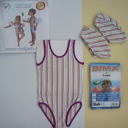 Combi Set "Lorli", bestehend aus Badeanzug mit passenden "Wetpets" (Stoffumhüllungen für Schwimmflügel), Gewinner der Innovation Award, Messe Kind und Jugend 2009,