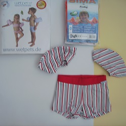 Combi Set "kleiner Matrose", bestehend aus Badehose mit passenden "Wetpets" (Stoffumhüllungen für Schwimmflügel), Gewinner der Innovation Award, Messe Kind und Jugend 2009,
