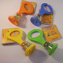 drei verschieden farbige Rasseln mit einer Kugel, gefüllt mit bunten Perlen.