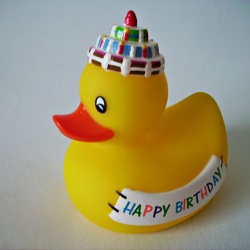 gelbe Badeente, mit Geburtstagstorte auf dem Kopf und Schriftzug Happy Birthday. Spritzfunktion,