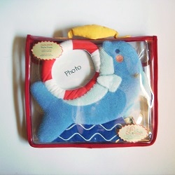 Hellblauer Frottee-Delfin mit integrierter Fototasche in Form eines Schwimmringes, kann aufgestellt oder aufgehängt werden, Oberfläche waschbar, ca. 20 cm, in passender Geschenktasche verpackt. Qualitätsprodukt der Firma "Latitude Enfant".