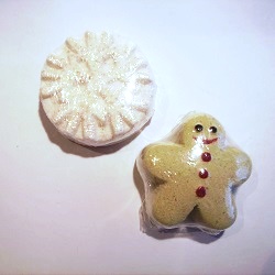 Badefizzer-Set in Form einer weißen Schneeflocke und eines beigen Lebkuchenmännchens,