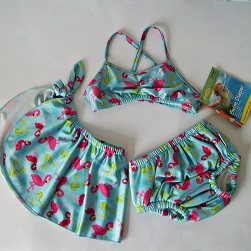 Bikinihöschen und Aqua-Windel zugleich, aussen Polyestermaterial, wasserdicht, Taillenbund der Hose durch Gummizug variabel, innen angenehmer Frottee aus Polyester,