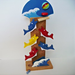 Delfin-Kugelbahn, ca. 25 x 45 cm, sobald die Kugel im Mund des Delfins landet, neigt dieser den Kopf und "spuckt" die Kugel ins Maul des nächsten Delfins. Material Holz.