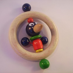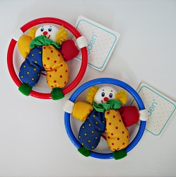 bunter Stoffclown, der an den Händen und Füßen in einem Plastikring befestigt ist, Arme und Beine lassen sich verschieben, Clown kann auch nach vorne oder nach hinten geschoben werden, Klappergeräusch, Farbe des Ringes rot, (blau vergriffen), Firma "Eden", ca 12 cm, mit Geschenkanhänger. Preis je Ring.