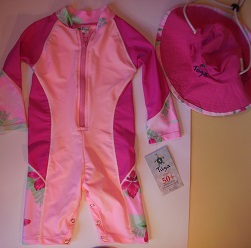 Einteiler, der ihr Mädchen beim Spielen im und am Wasser schützt, knielang und lange Ärmel, Grössen 1 Jahr (74/80), Material 80 % Polyester, 20 % Lycra, weicher, angenehmer Stoff mit flachen Nähten gegen Scheuerstellen, Anzug schnelltrocknend, Farbe pink-rosa mit Muster, Abblockung von mehr als 97,5 % der schädlichen UV-Strahlen, UPF50+ gemäß AS/NZS 4399:1996, Grösse 1 Jahr hat Klappen auf der Innenseite der Beine für einfaches Auswechseln der Windeln. Der Wendehut ist passend dazu und hat innen das rosa Blumenmuster.