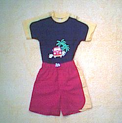 T-Shirt: Farbe blau-gelb mit Motiv "Bulli", Short: Farbe rot-gelb mit Gummizug im Bund,