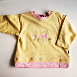 Sweatshirt aus 100 % Baumwolle, waschbar bei 40° C, Farbe gelb mit rosa Bordüren, 2 "Quacky"- Entenmotive auf der Vorderseite, große Ente in der Badewanne,