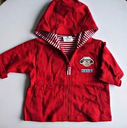 Jacke mit Kapuze, 100 % Baumwolle, waschbar bei 40° C, Farbe rot , Reißverschluss, Motiv auf der Vorderseite: Matrosengesicht, Motiv auf der Rückseite: Segelboot, Größen 68, 74 und 86.