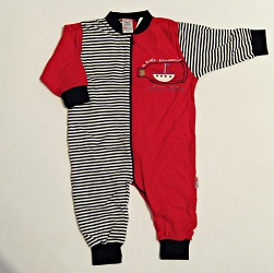 Schlafanzug aus 100 % Baumwolle, waschbar bei 60° C, Trocknergeeignet, Farbe marine-weiß-gestreift und rot, Motiv auf der Vorderseite: Buddelschiff als Souvenir, Reißverschluss bis zum Schritt, Größen 68 und 74.