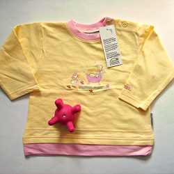 Sweatshirt aus 100 % Baumwolle, waschbar bei 40° C, Farbe gelb mit rosa Bordüren, 2 "Quacky"- Entenmotive auf der Vorderseite, große Ente in der Badewanne,