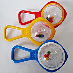 drei verschieden farbige Rasseln mit einer Kugel, gefüllt mit bunten Perlen.